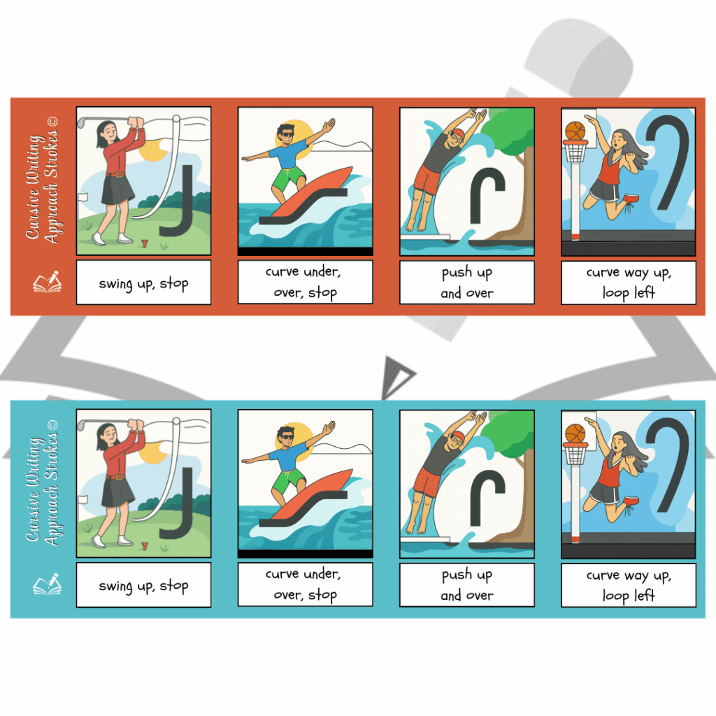 - The instructional strips have a modern look, showcasing the four cursive writing approach strokes.