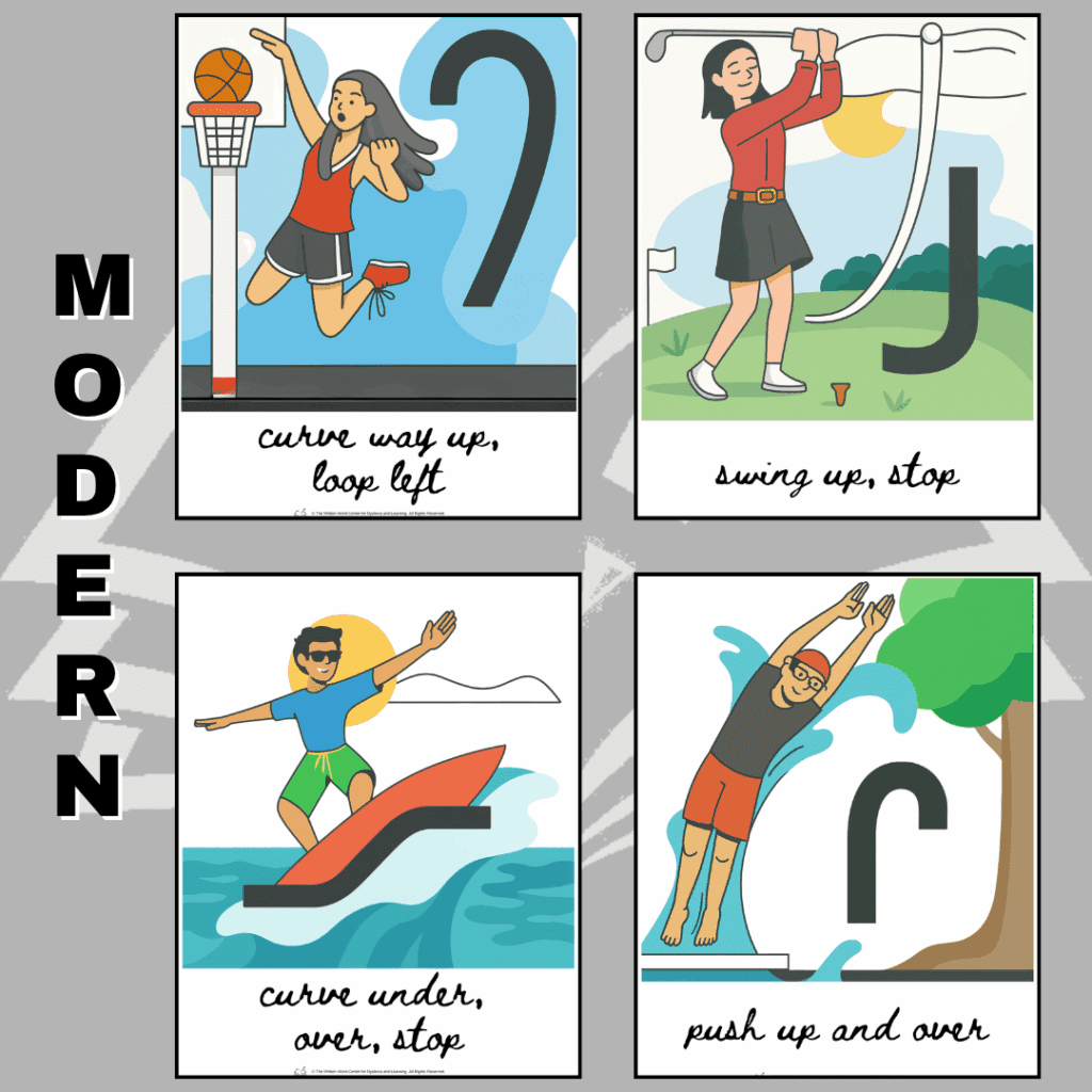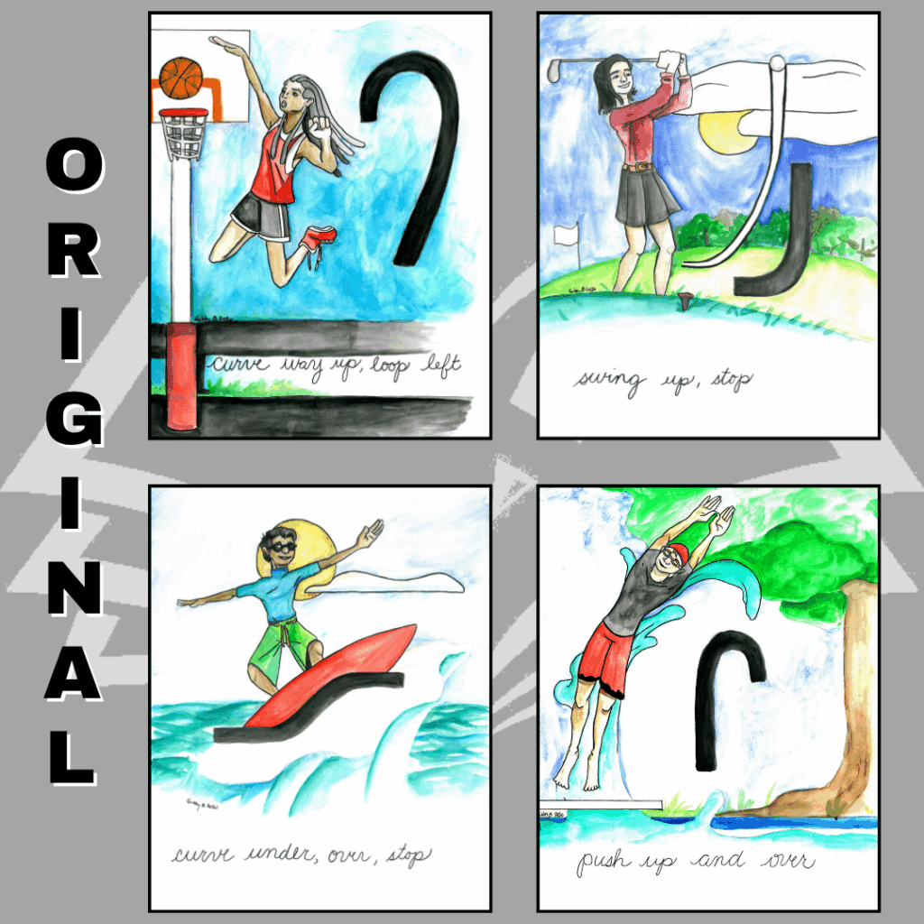 Hand-drawn instructional posters showing the four cursive writing approach strokes.